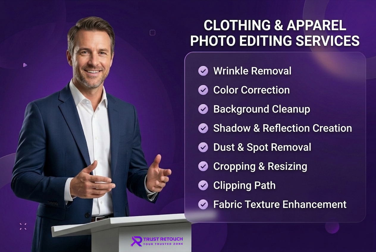 At Trust Retouch, we specialize in furnishing high- quality apparel print editing services acclimatized to your specific requirements. Whether you need to enhance the fabric's details, change the background, or correct lighting, our platoon ensures that each image is indefectible and ready for your online store, advertisements, or portfolio. Trust us to deliver clean, vibrant, and professional images that punctuate the beauty and quality of your apparel!