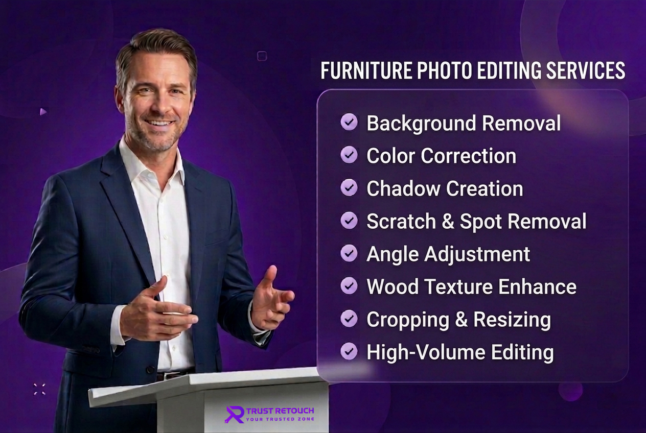 Trust Retouch offers specialized furniture photo editing services to enhance the appearance of your products. Our team focuses on cleaning, background removal, color correction, and other detailed retouching to make your furniture images look sharp, attractive, and ready for online platforms. Whether for catalogs, eCommerce, or promotional materials, we ensure professional, eye-catching visuals that elevate your brand.