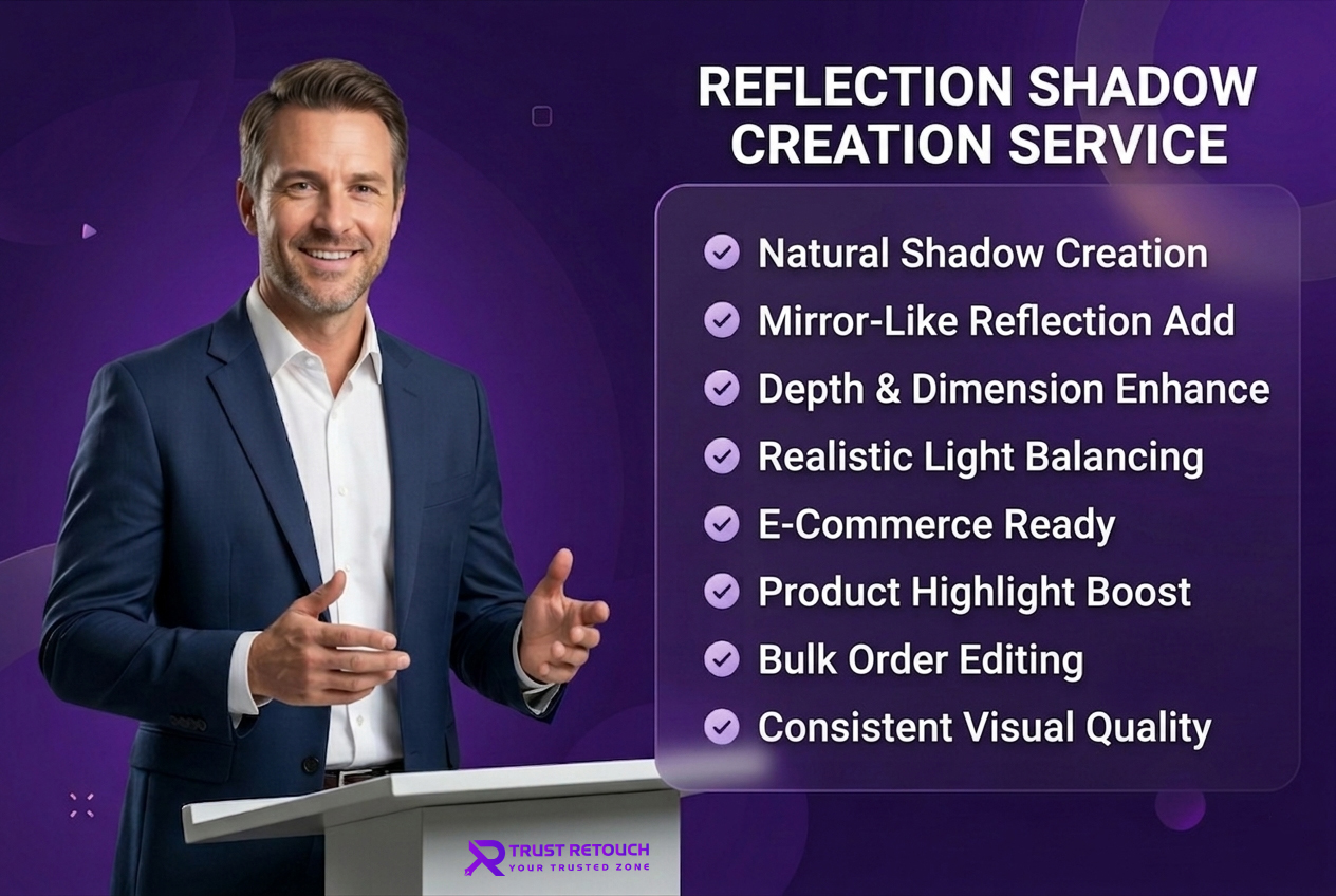 At Trust Retouch, we specialize in adding professional reflection shadows to your product photos, creating a realistic, polished look. Whether you need reflections for shoes, jewelry, or other products, our team ensures the perfect balance between aesthetics and realism. This service is ideal for eCommerce platforms, advertisements, and catalog images, giving your products a high-end, professional finish.